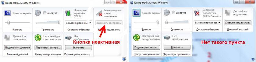 Если попытаться включать беспроводную связь через Центр мобильности (вызывается сочетанием клавиш Win+X, а в Windows 10 Win+X и выбрать пункт “Центр мобильности”), то скорее всего там либо вообще не будет кнопки “Включить беспроводную связь”, либо на будет невозможно нажать (неактивная).