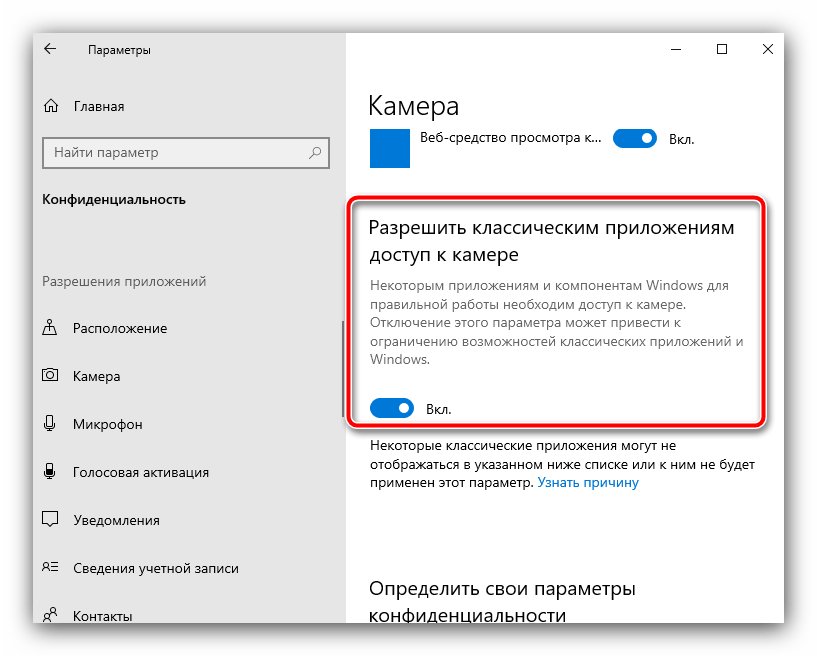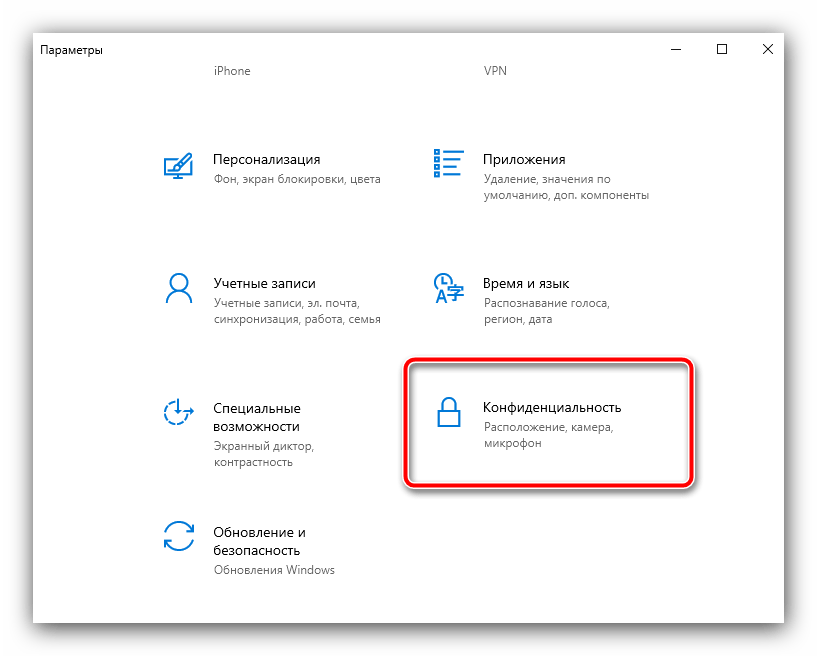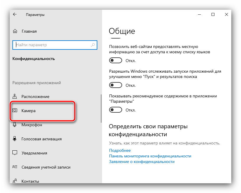 В Windows 10 достаточно много внимания уделено настройкам приватности – доступ программам к тем или иным устройствам требуется предоставлять отдельно. Активный глобальный запрет на её использование может приводить к рассматриваемой проблеме, решение которой следующее: