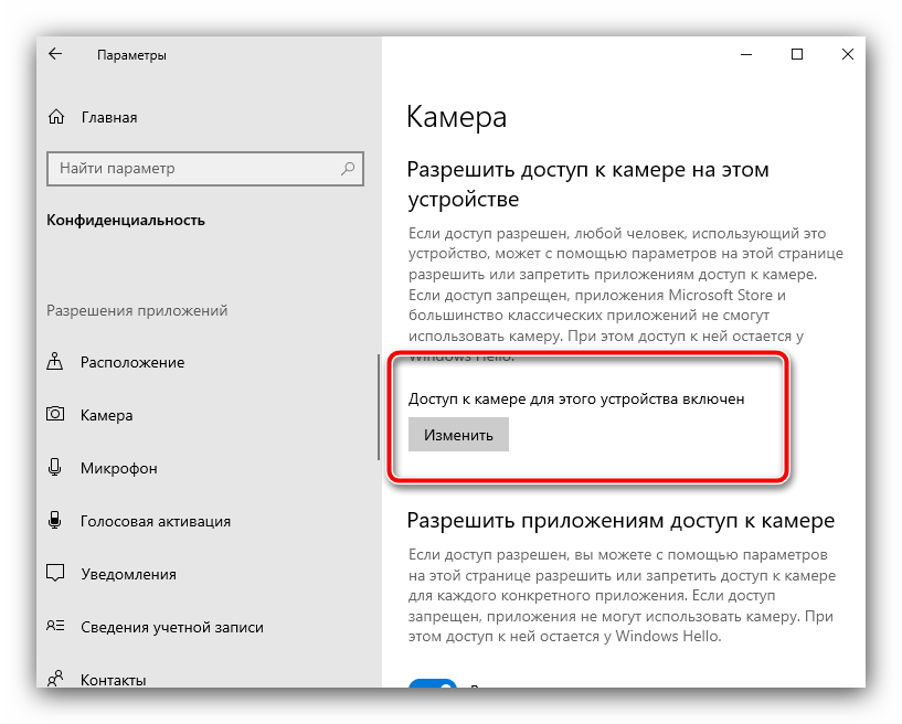 5. Убедитесь в том, что под заголовком страницы выводится «Доступ к камере для этого устройства включен». В противном случае щелкните по кнопке «Изменить» и предоставьте доступ.