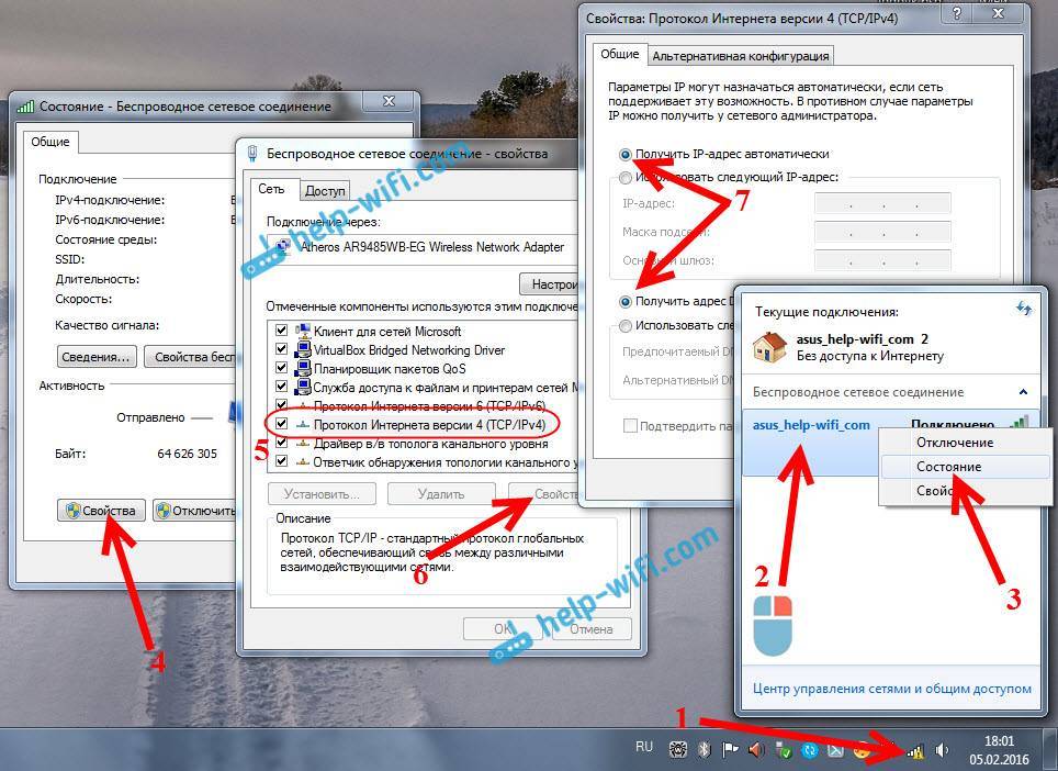 рис.1. Для начала следует зайти на вкладку центра управления сетямирис.2. Перейдя в раздел «Изменение параметров адаптера», войти во вкладку «Свойства» локальной сетирис.3. Выбрав «TCP/IPv4» зайти в его свойства, где проверить галочку напротив автоматического получения IP и DNS