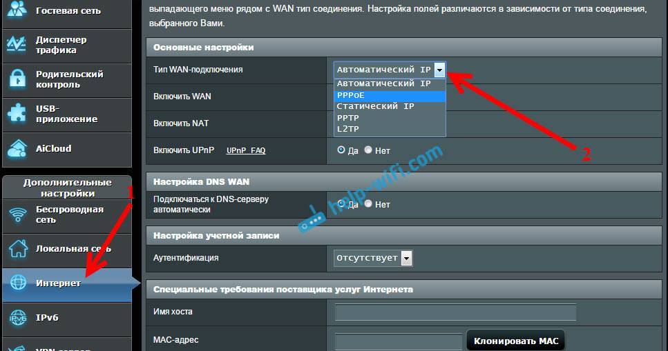 В настройках нужно перейти на вкладку Интернет. Выбрать правильный тип WAN-подключения, который использует ваш интернет-провайдер, и задать необходимые параметры (которые зависят от выбранного типа соединения). Вам нужно уточнить у провайдера, какой тип соединения он использует: Динамический IP, Статический IP, PPPoE, L2TP, PPTP.