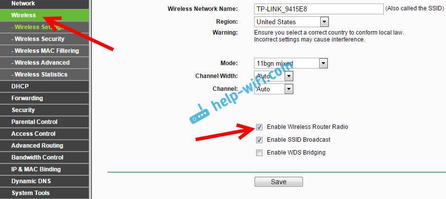 В настройках перейдите на вкладку Wireless, и посмотрите, установлена ли галочка возле пункта Enable Wireless Router Radio. Именно этот пункт в настройках отвечает за включение беспроводного модуля.