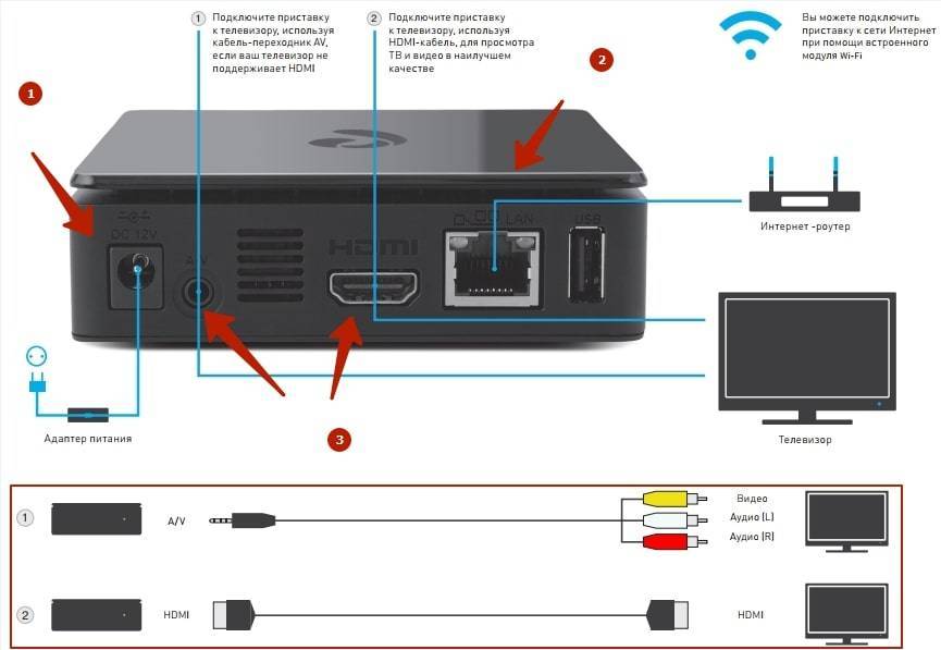 - Устройство подключается к телевизору с помощью hdmi или «тюльпана».