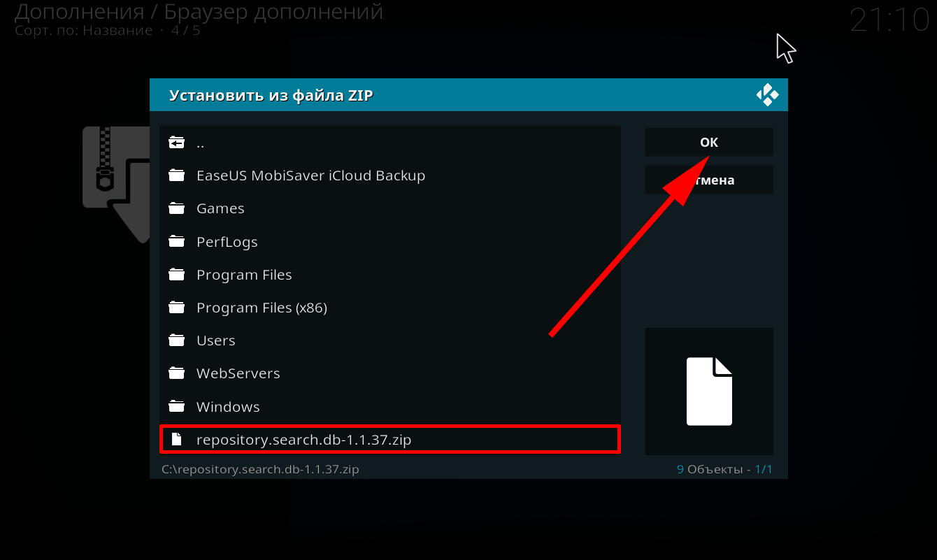 - Используйте окно браузера, чтобы указать Kodi на ZIP-файл.
