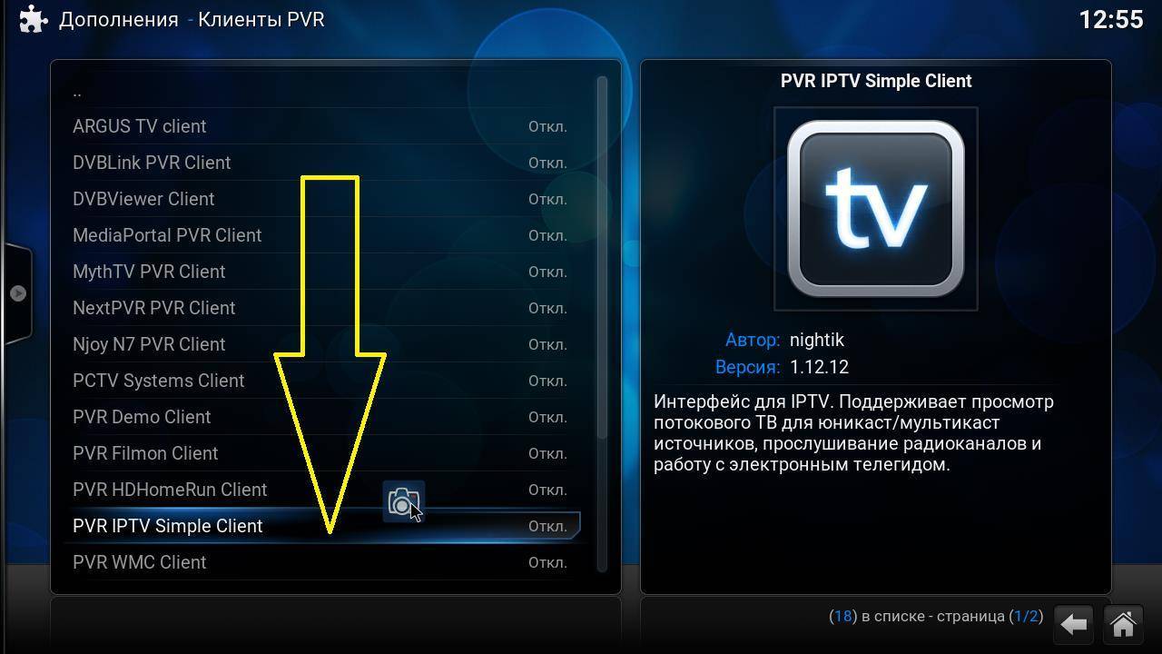 - В открывшемся окне найдите и выберите пункт «PVR IPTV Simple Client».