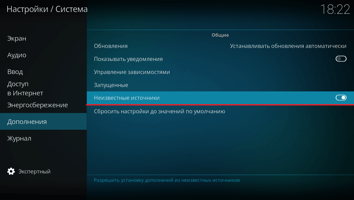 - перейти в «Настройки» => «Система» => «Дополнения»;