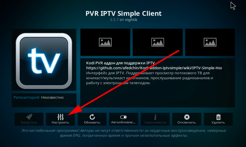 - Вновь кликните на строку «PVR IPTV Simple Client» и в открывшемся окне выберите пункт «Настроить».