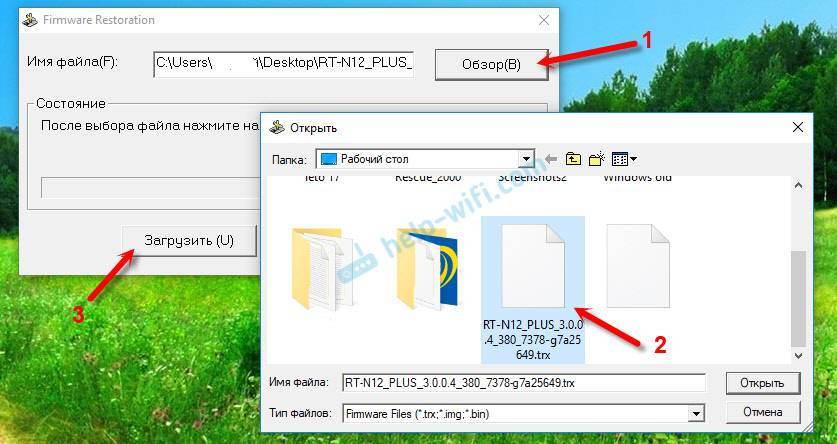 Дальше стоит установить загруженную утилиту на компьютер. После этого ее придется запустить, а в ней потребуется указать путь к файлу bin прошивки роутера Asus RT-N12. Не стоит спешить с отправкой файла, сначала нужно перезапустить роутер. Чтобы это сделать потребуется вытащить блок питания, после чего нужно будет удерживая кнопку сброса, воткнуть его в розетку. При этом роутер должен медленно замигать, это покажет, что он находится в режиме восстановления. Когда он только начнет запускаться можно отправлять файл на установку.