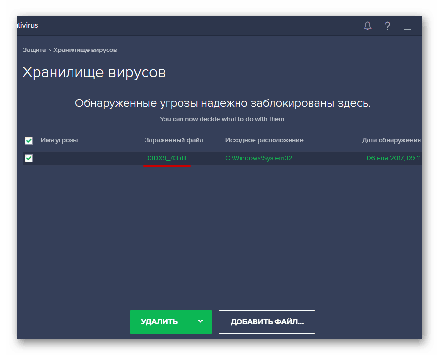 В некоторых случаях антивирус может заблокировать файл d3dx9_43.dll. Для решения этой проблемы нужно зайти в программу, открыть карантин и посмотреть не находится ли там нужный файл. В случае обнаружения убираем компонент библиотеки DirectX из карантина.