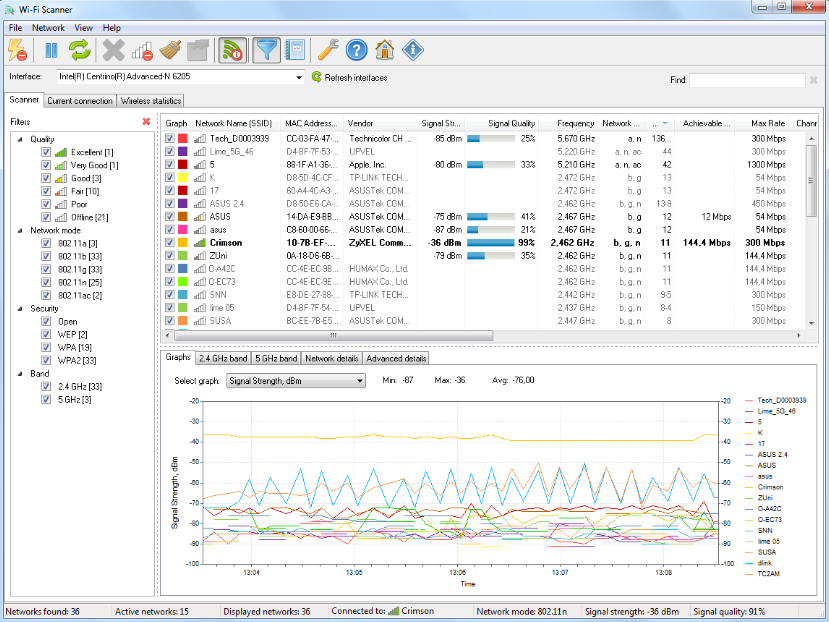- Запустите приложение. Вы увидите список сетей, уровень их сигнала и техническую информацию, например какие каналы они используют.