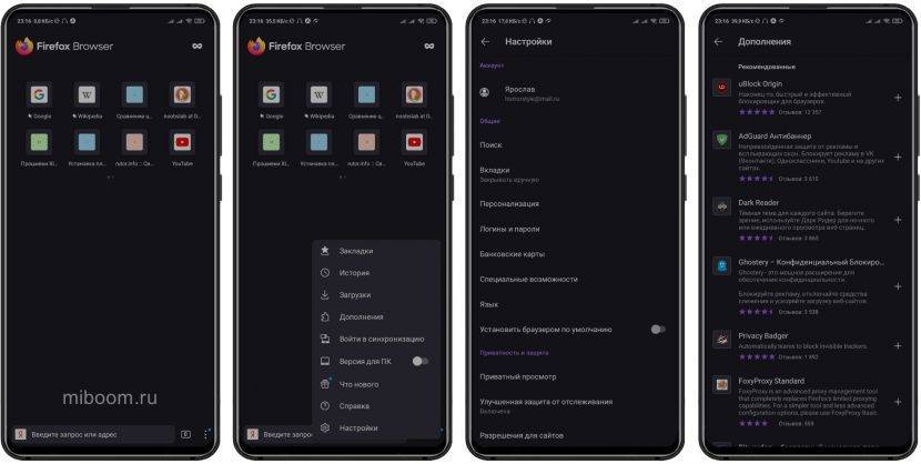 Главное преимущество данного браузера для работы на Андроид устройстве заключается в доступе к широкой коллекции расширений, в частности можно синхронизироваться с учетными записями, включать режим чтения, активизировать блокировщик отслеживания.