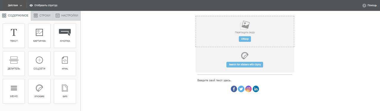 Один из популярнейших сервисов емейл-рассылок в России. У него очень простой интерфейс, в нем легко разобраться, поэтому его часто используют новички. Каждый шаг создания письма сопровождается подсказками. Редактор блочный, и его можно протестировать без регистрации. Есть коллекция из 100+ бесплатных шаблонов. Можно в один клик добавить фото из фотостоков, а также GIF-анимацию с Giphy.