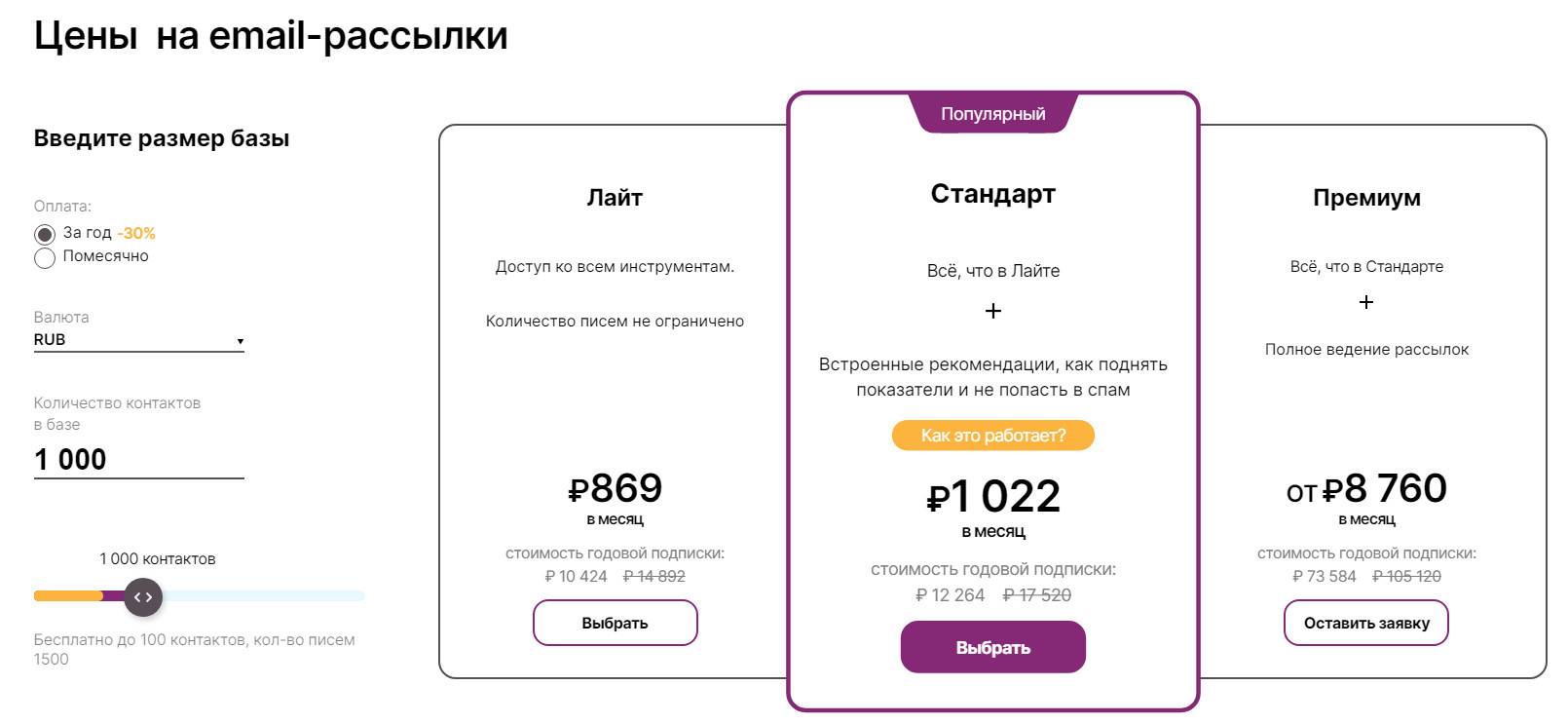 Есть бесплатный тариф, в котором можно отправлять до 2000 писем в месяц базе до 100 человек. Дальше стоимость начинается от 600 руб. в месяц и зависит от размера подписчиков.