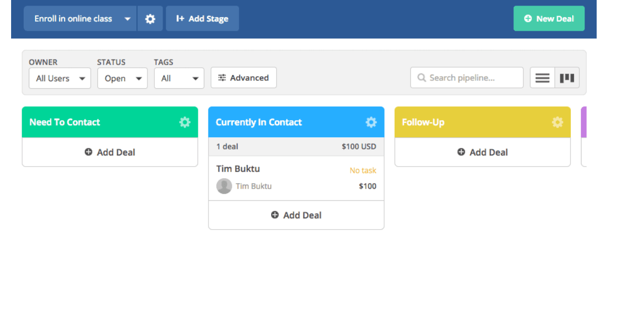 Воронки продаж имеют вид колонок и больше похожи на CMR-систему, поскольку они заточены под взаимодействие с контактами. Вы можете фильтровать контакты, сортировать, присваивать им баллы и перетаскивать между воронками.