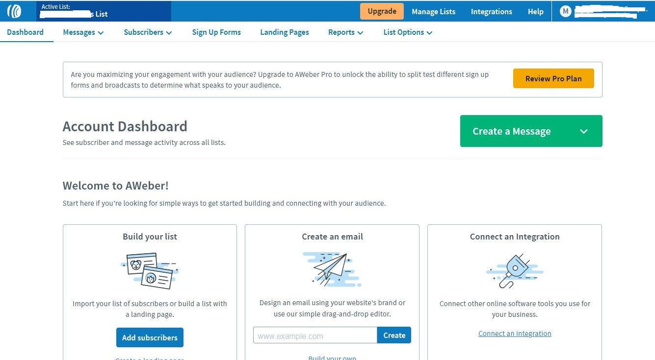 Регистрация проходит в один клик. После получения письма-подтверждения сервис емейл рассылки AWeber просит выбрать тарифный план, а также указать физический адрес, создать список получателей. Эти шаги пропустить нельзя.