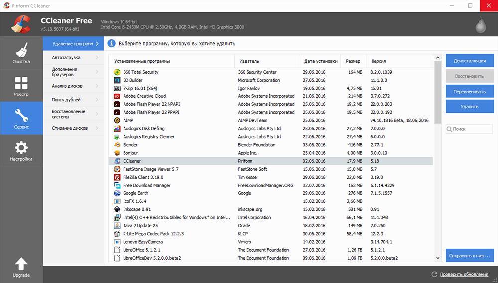 CCleaner – главное окно