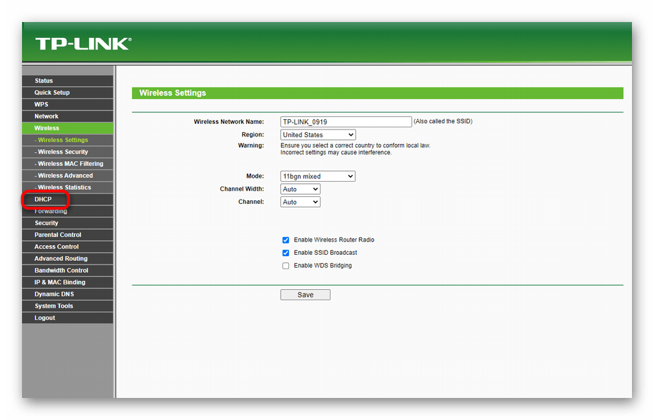 - войдите на страницу с настройками с левой стороны и кликните по вкладке Wireless;