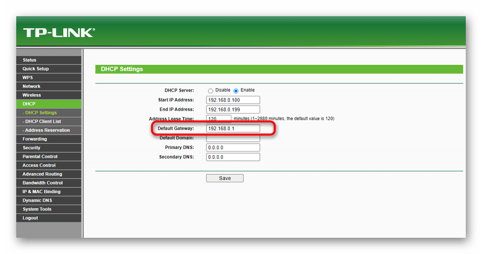 В качестве шлюза по умолчанию установите IP-адрес главного маршрутизатора.