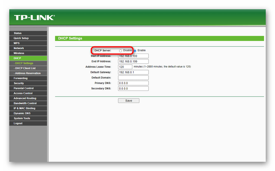 Отключите DHCP-сервер, поместив маркер в соответствующий пункт.