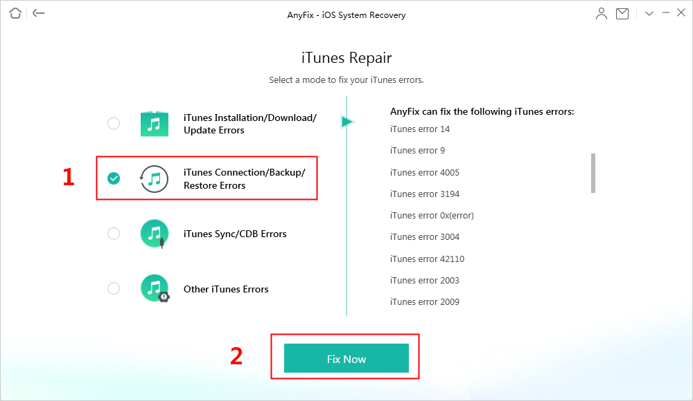 Step 2. In this part, choose the iTunes Connection/Backup/Restore Errors and then tap on the Fix Now to go on.
