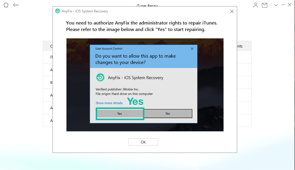 Step 3. Here, you need to authorize the administrator’s rights to AnyFix to repair the iTunes. Click on the Yes and OK button to continue.