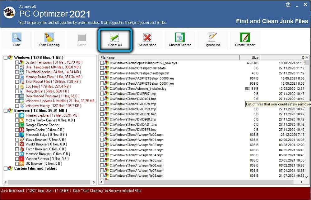 Начнётся поиск мусорных файлов на компьютере, в результате высветится список файлов, подлежащих удалению/очистке. Кликаем по кнопке Select All, чтобы не проставлять галочки вручную, нажимаем кнопку Start cleaning, дожидаемся завершения процесса.