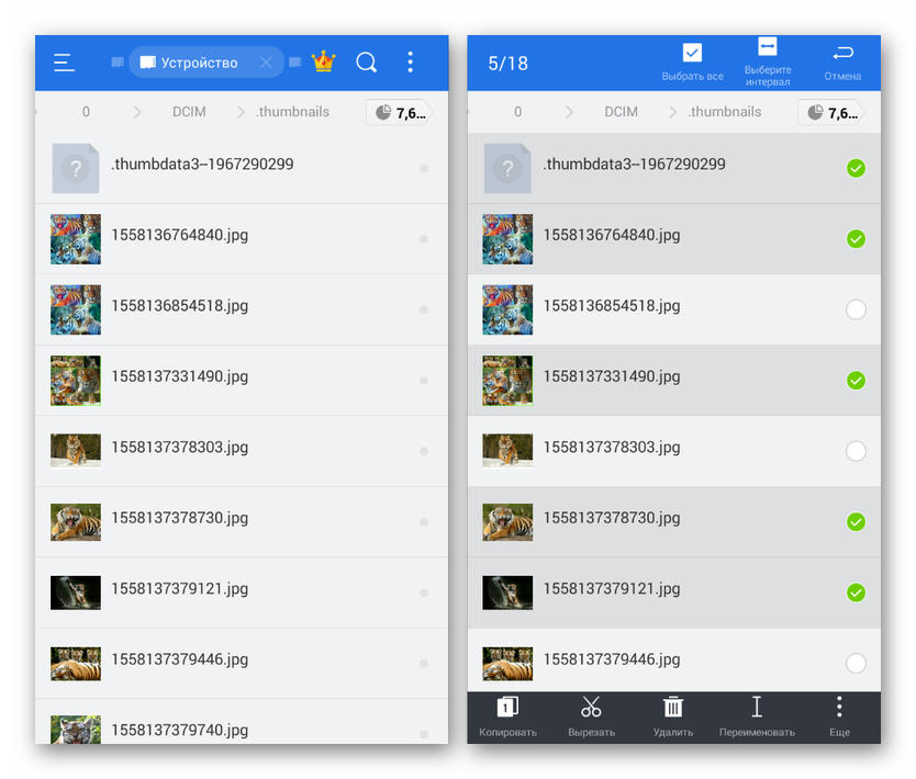 Для выборочного удаления откройте «.thumbnails» и выберите ненужные документы по аналогии с предыдущим шагом. Особое внимание уделите файлу «.thumbdata3», так как именно он содержит в себе эскизы и занимает место на смартфоне.