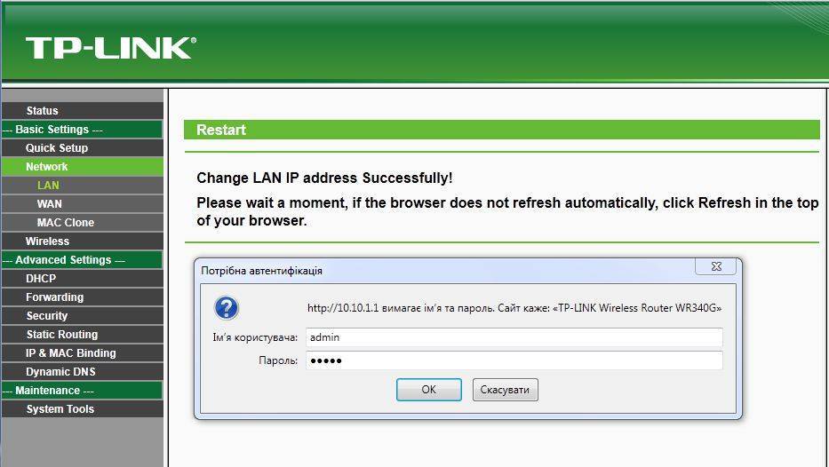 Дальше заходим на роутер под новым адресом 10.10.1.1