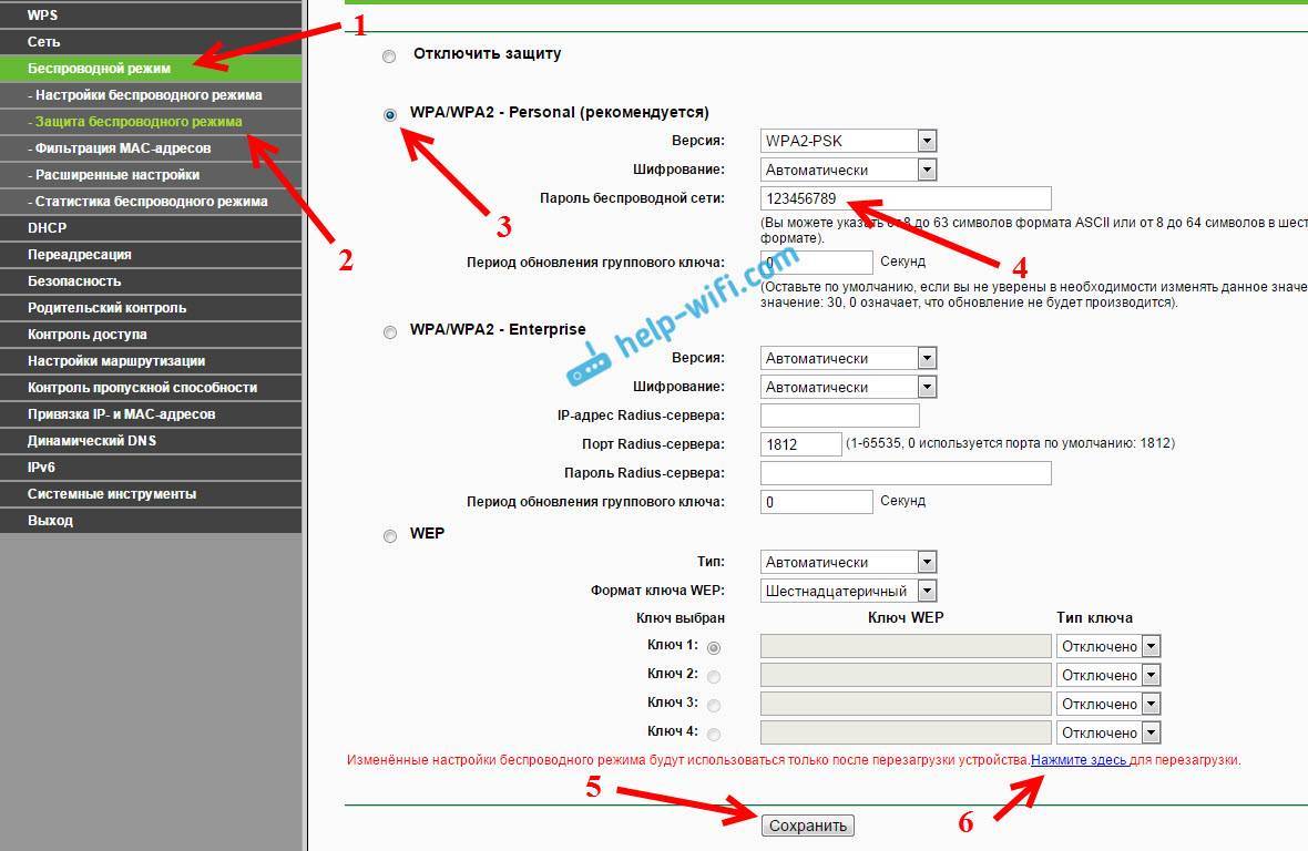 Здесь нужно выделить пункт WPA/WPA2 – Personal (рекомендуется), выставить остальные параметры как у меня на скриншоте ниже, и в поле Пароль беспроводной сети придумать и записать пароль, которым будет защищен ваш Wi-Fi. Пароль должен быть минимум из 8 символов. Нажмите на кнопку Сохранить, и можете сразу нажать на ссылку “Нажмите здесь”, что бы перезагрузить роутер.
