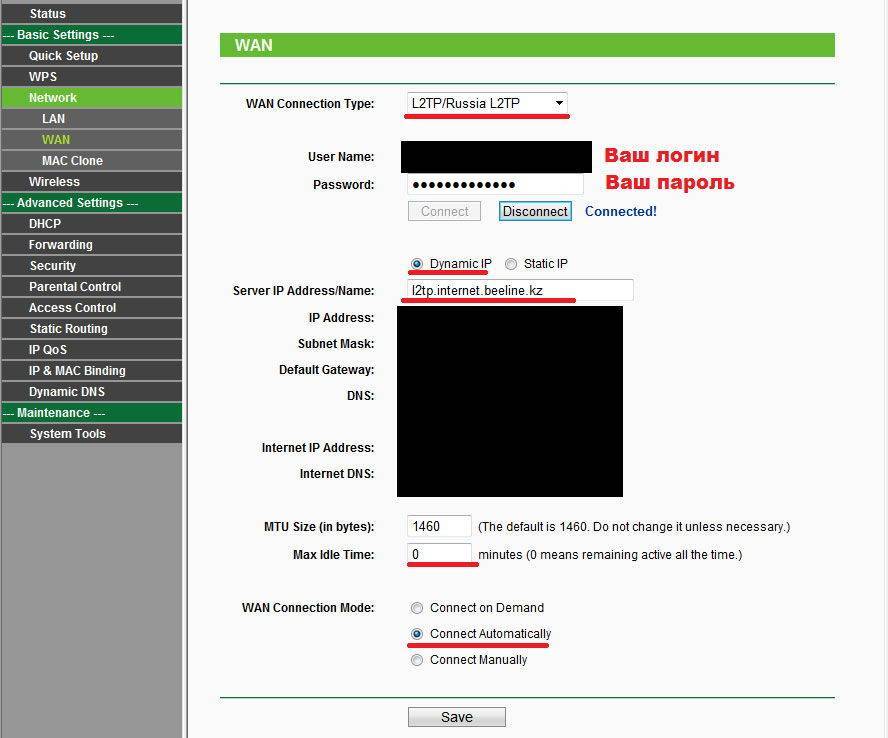 Хорошим примером и для предыдущего случая станет настройка L2tp для Билайн на Tp-Link Tl Wr841n. «Тип подключения WAN» — «L2TP/ Россия L2TP».