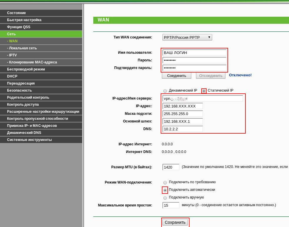 Ещё одна разновидность соединения, чаще всего используется небольшими провайдерами, где сеть покрывает всего один-два квартала. Но тот же Beeline использует такую сеть в сочетании с дополнительными протоколами шифрования. Тип подключения выбирается во вкладке «Сеть», там же нужно ввести логин/пароль, предоставленный провайдером. Обязательно затем выбрать «Сохранить», роутер сразу применит указанные настройки без перезагрузки.