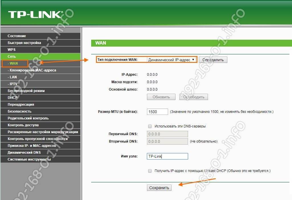 Тут достаточно в поле «Тип подключения WAN» просто поставить точку на пункт Динамический IP-адрес и, ничего более не меняя, применить настройки нажав на кнопку Сохранить. После этого выход в Интернет должен быть доступен. Подключаем кабель и проверяем.