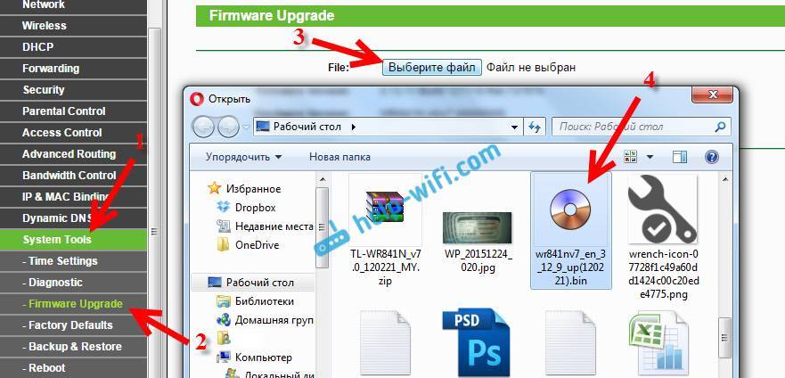 В настройках переходим на вкладку System Tools – Firmware Upgrade. Нажимаем на кнопку Выберите файл, и выбираем в проводнике файл прошивки, который мы скачали.