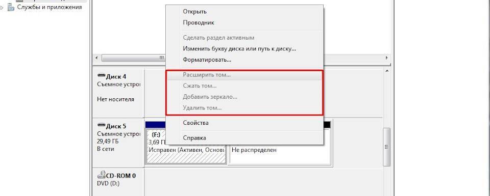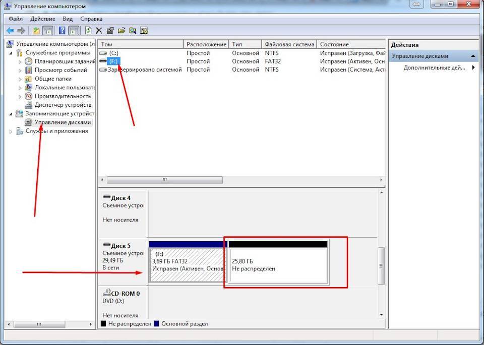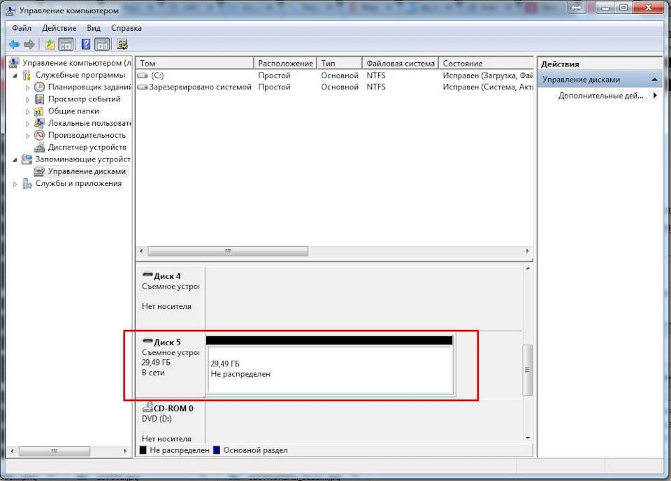 И далее «Управление дисками». Находим здесь свою флешку. В моем примере на носителе был один размеченный том размером 4 ГБ, который как раз и отображался в системе. Остальной объем памяти был неразмечен, поэтому и не виден реальный размер, а казался меньше, чем на самом деле.