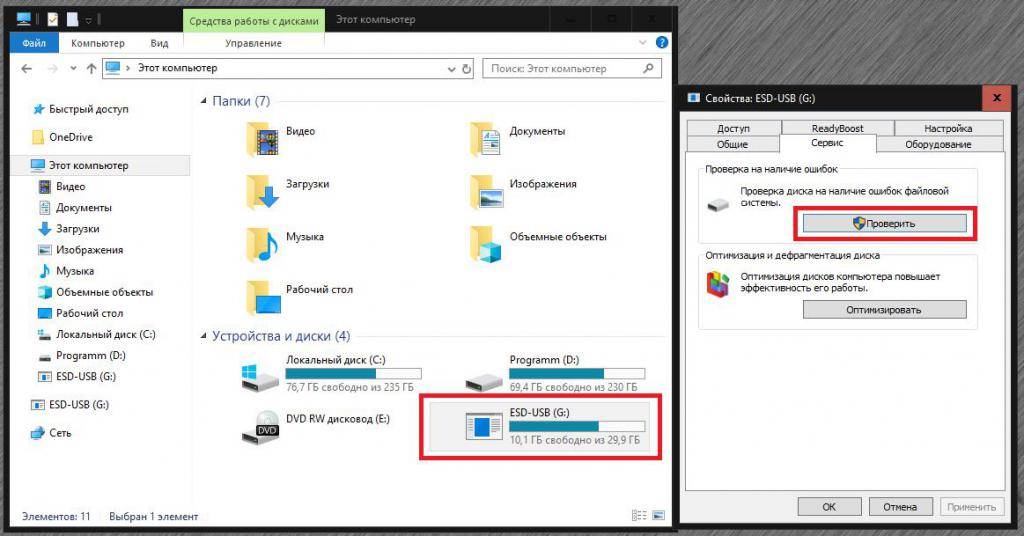 В качестве одного из самых простых вариантов некоторые специалисты рекомендуют использовать стандартное средство Windows-систем для проверки накопителя на ошибки с автоматизированным их исправлением, к которому можно получить доступ через раздел свойств съемного диска в «Проводнике».