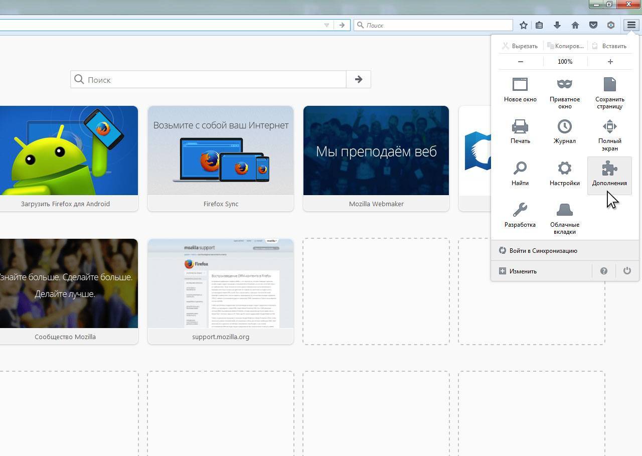 - Выбрать меню в правом верхней углу, кликнуть и перейти в пункт Дополнения или использовать комбинацию клавиш Ctrl+Shift+A;