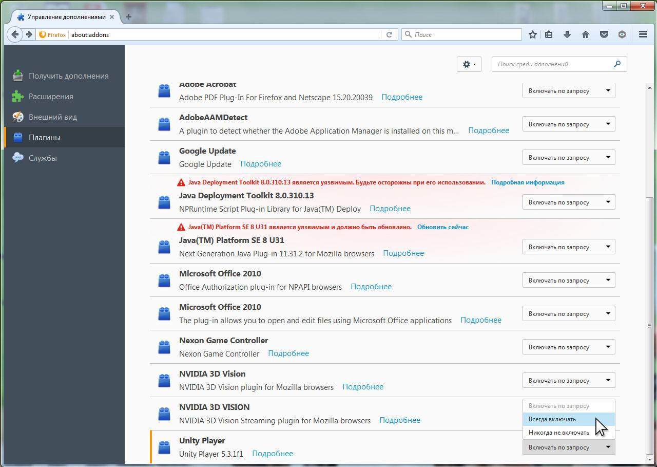 Unity Player не нуждается в настройке, автоматически встраивается в браузер, самостоятельно запускается и обновляется при необходимости. Однако в некоторых случаях может понадобиться включать или выключать плагин, что доступно в настройках браузера. Подробно распишем процесс активации плагина Юнити Плеер на примере браузеров Internet Explorer и Mozilla Firefox.