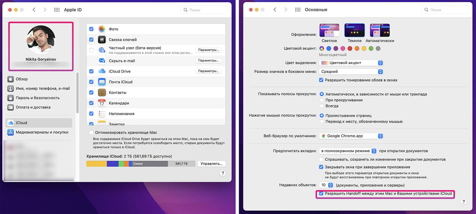 Наконец, проверьте, что на обоих Mac включена функция Handoff: Системные настройки -> Основные -> Разрешить Handoff между этим Mac и Вашими устройствами iCloud.