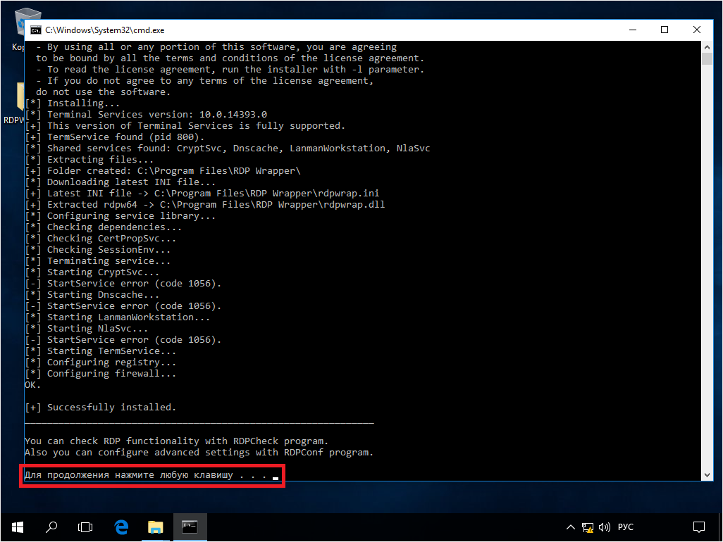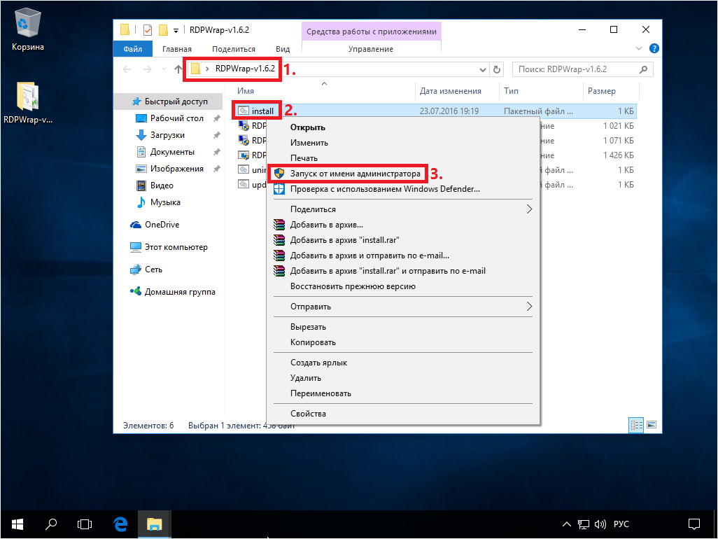 3. Распакуйте (прим. с помощью WinRAR или просто открыть через Проводник) скачанную Вами ранее библиотеку RDP Wrapper Library. Откройте папку и запустите от имени администратора (прим. используя правую кнопку мыши) файл install,после чего начнётся установка (Рис.15).