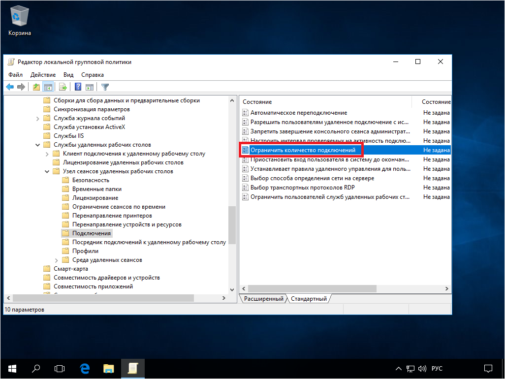 7. Выберите: Конфигурация компьютера > Административные шаблоны > Компоненты Windows > Службы удалённых рабочих столов > Узел сеансов удалённых рабочих столов > Подключения > Ограничить количество подключений (Рис.19).
