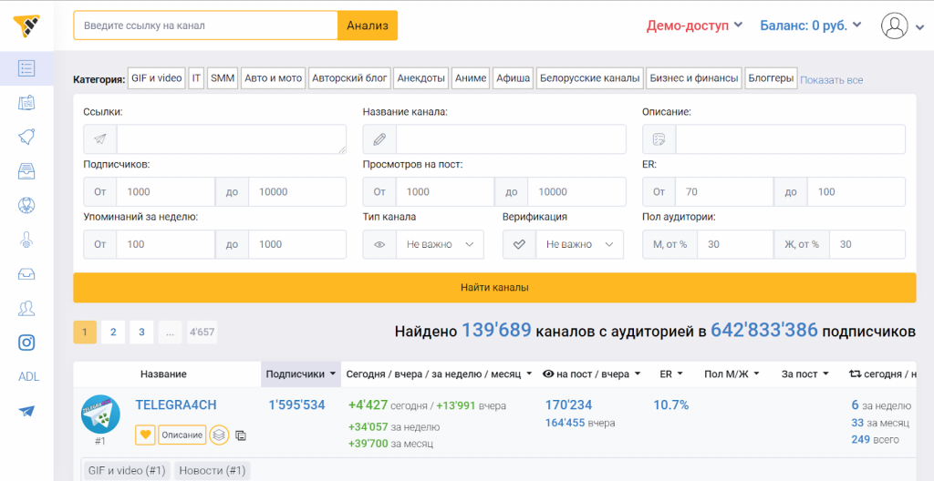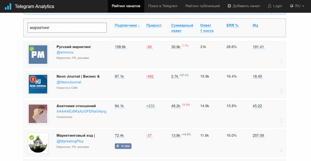 Telegram Analytics. Здесь можно найти подходящий канал по геолокации и категории. По каналам показана статистика — количество подписчиков, охват постов, прирост аудитории. При подробном изучении аналитики канала можно изучить график публикаций, число упоминаний и репостов канала, цитируемые каналы.
