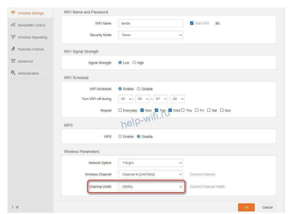 Параметры выбора ширины канала Wifi в программной оболочке от Tenda находятся на вкладке Wireless Settings.