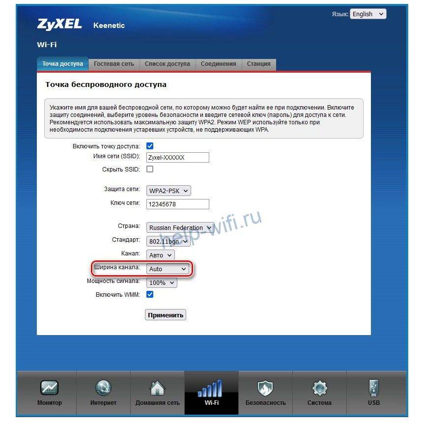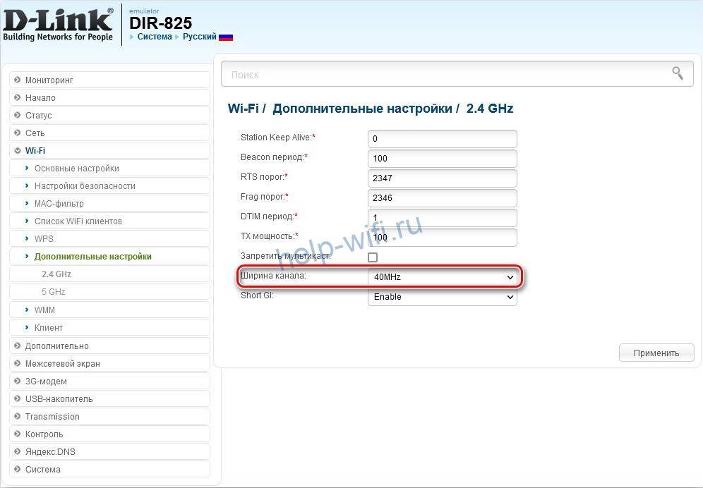 Важно! Если интерфейс роутера не поддерживает русский язык, то искомый параметр в английской терминологии называется Bandwidth (Channel Width)