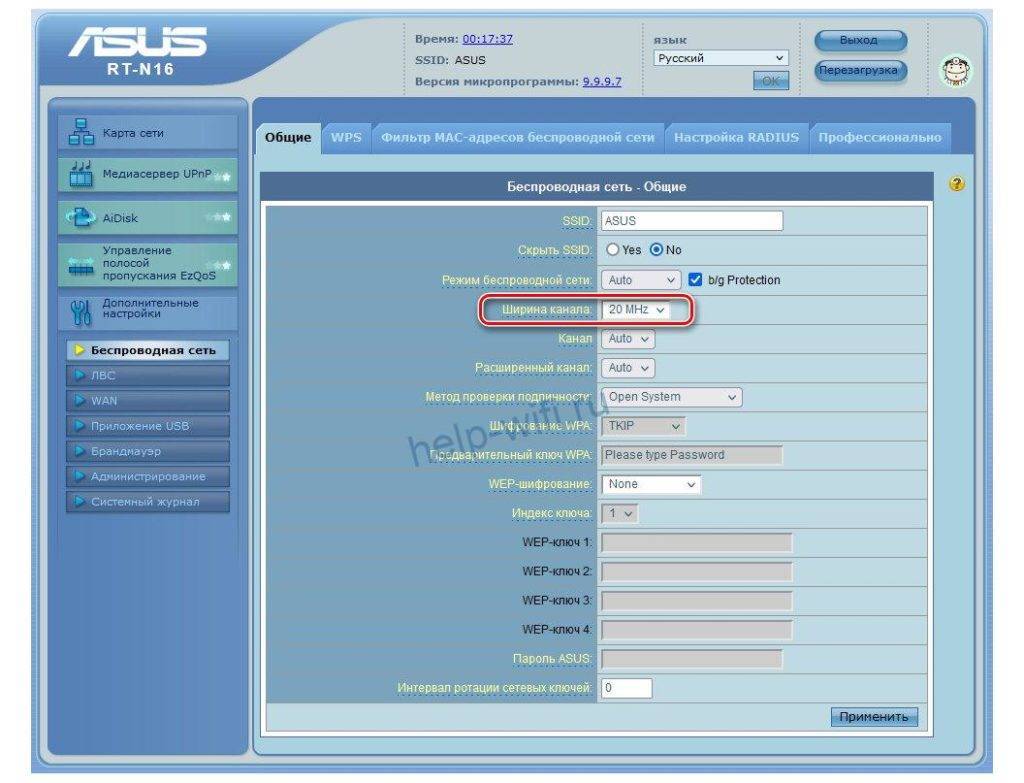 Войти в веб-меню роутера данного производителя можно таким же способом, как и для Tp-Link. В меню маршрутизатора Asus в разделе нужно выбрать подраздел «Беспроводная сеть», далее пункт «Ширина канала». Из выпадающего списка выбрать и установить необходимое значение.