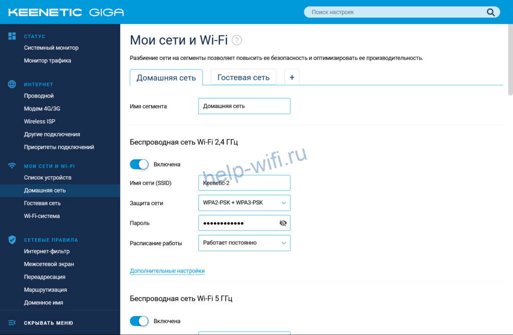 Чтобы указать ширину канала Wifi в современных маршрутизаторах Keenetic, понадобится перейти на вкладку «Домашняя сеть» в разделе «Мои сети и Wi-Fi».