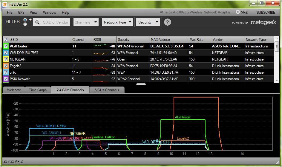 На графике вы увидите представление своей и соседских сетей (учитывайте, что сеть, допустим, на 6-м канале, затрагивает также и соседние каналы): их каналы и мощность. Вверху слева от графика можно переключить диапазон (2.4 ГГц и 5 ГГц).