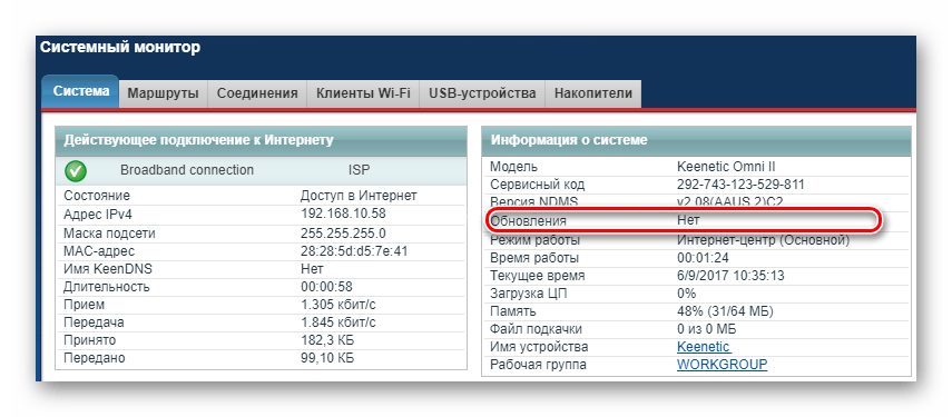 - В окне мониторинга системы проверить наличие обновлений для NDMS.